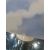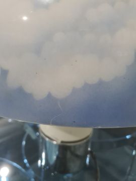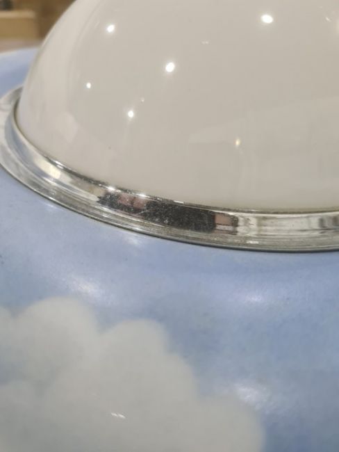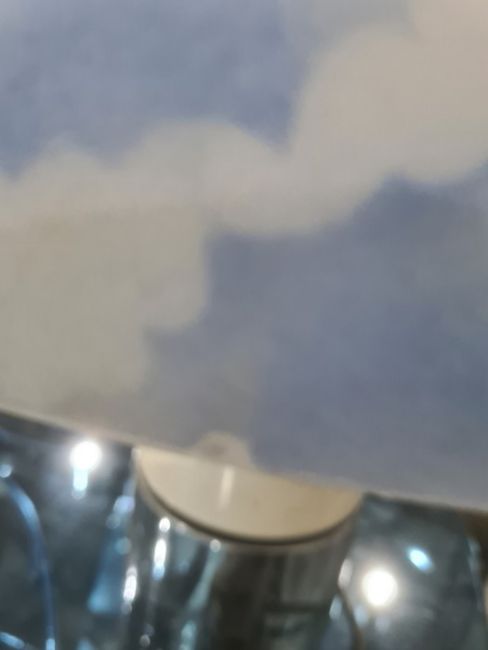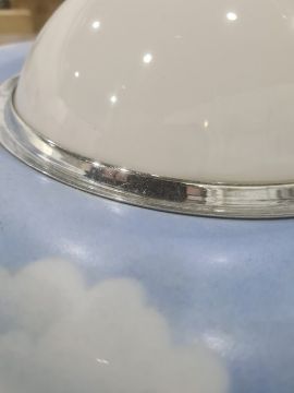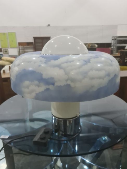 Large 1970's plastic table lamp with circular shade of blue sky and clouds, on cylindrical base with three settings Condition ReportThe larger diameter is 46cm the central diameter is 14cm and the total height is 44cm. There are marks to the silver base and to the silver section in the middle. There is a scratch to the shade as well as some worn areas. See attached images. one bulb holder taped over,