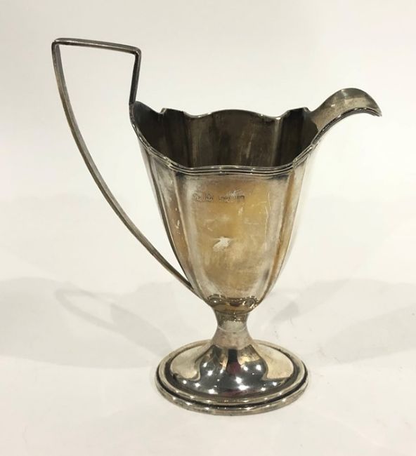Edwardian silver cream jug of revived Georgian style, oval, footed with thread edge and on oval foot, Birmingham 1905, 14cm high