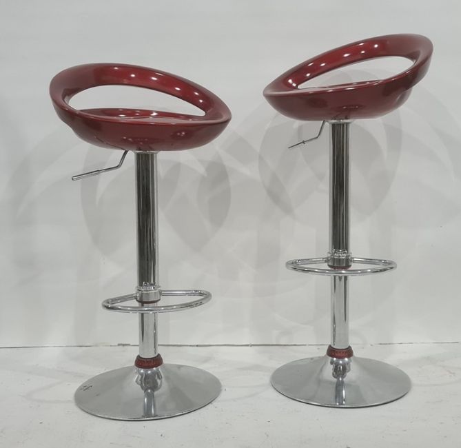 Pair of red seated plastic and chrome based breakfast bar stools (2)  please see additional imagesCondition Reportno apparent damage, some wear on the back rest and on the base commensurate with light use