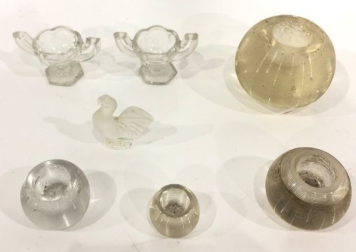 Lalique satin and clear glass model chicken, 7.5cm high, four various glass bulbous match holders with reeded sides and a pair of small glass two-handled pedestal vases (7)