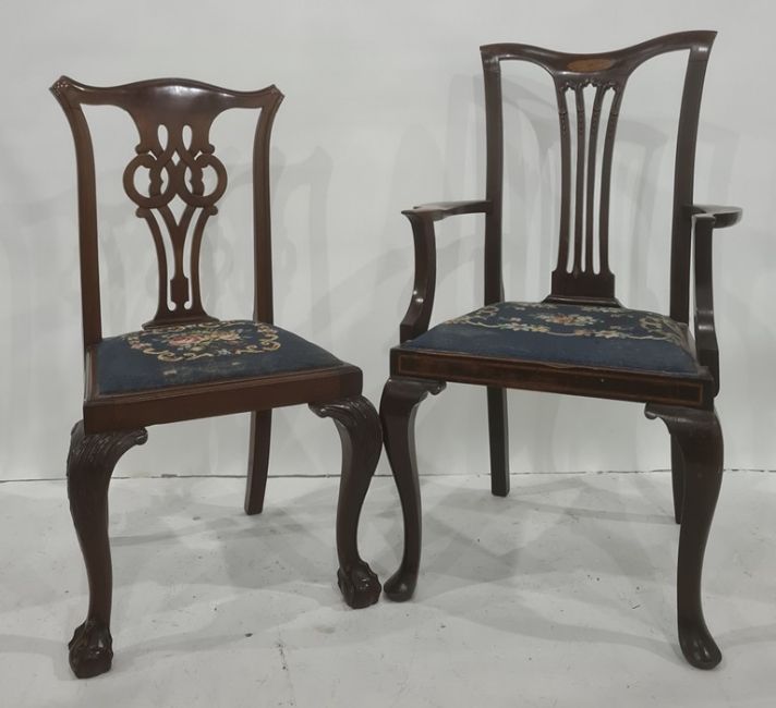 Early 20th century mahogany chair with shaped top rail above satinwood inlay, cabriole front legs and early 20th century Georgian-style chair (2)