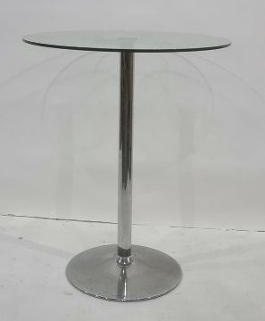 Modern circular glass-topped breakfast bar table on chrome single pedestal support, 80cm diameter