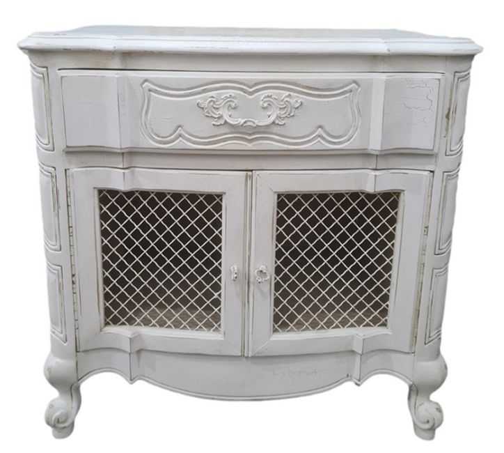 20th century white painted cupboard, the shaped top above single drawer, two grilled cupboard doors, on cabriole legs, 68cm x 67cm