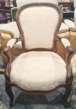 19th century-style mahogany framed spoonback armchair, with carved hand rests, cabriole legs