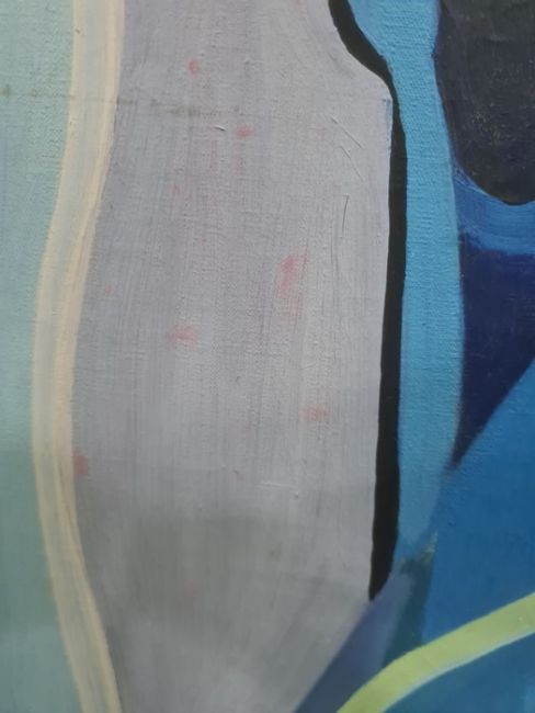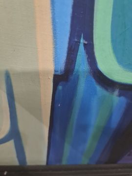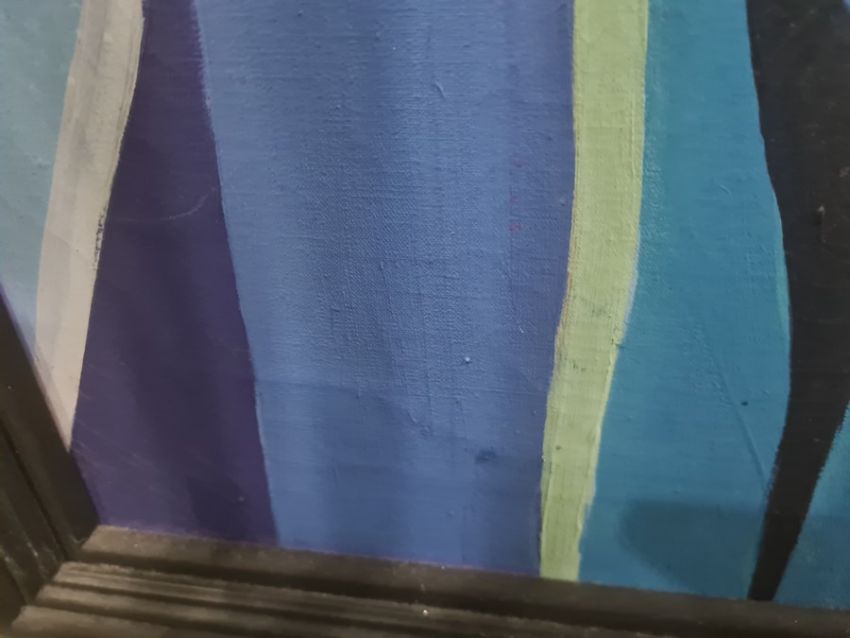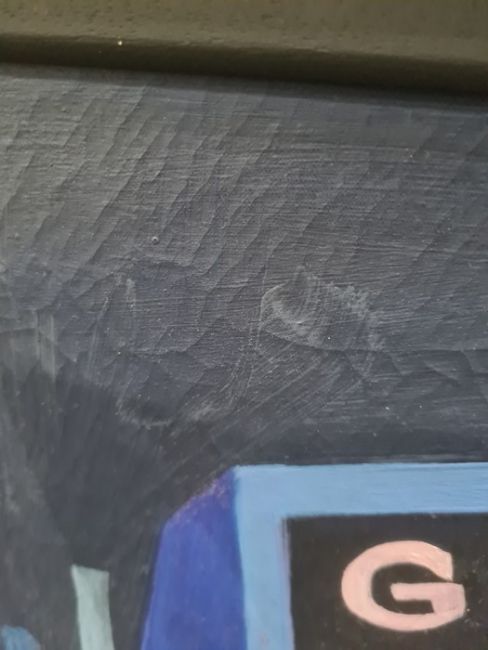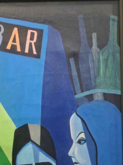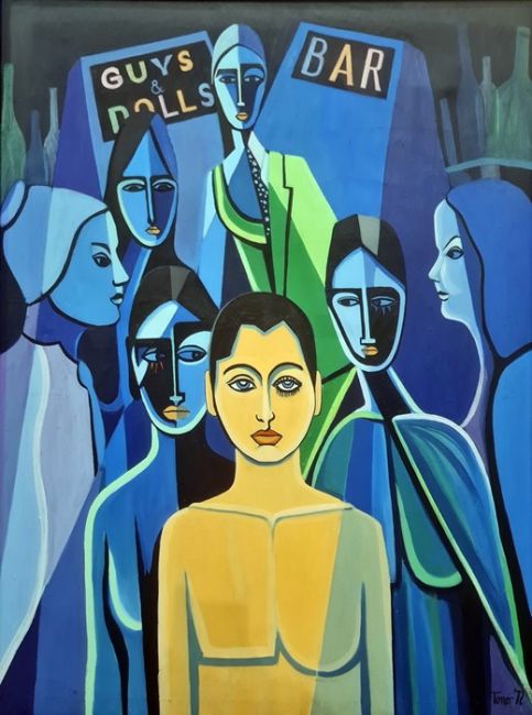 David Toner (b. 1944)Oil on canvas"Guys and Dolls, Bar", signed and dated 72 lower right, 84cm x 103.5cm Condition ReportThere is some cracking to the the paint in spots. There is one spot of white to the bottom right corner. There are some marks to the bottom right. The left most person has a dent to the body and some wear to the body and face. See attached images.