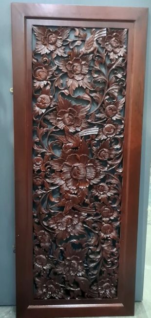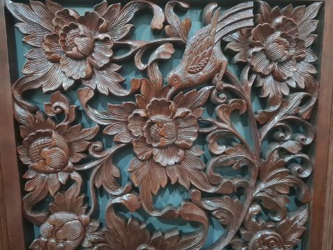 Modern eastern carved stained wood panel featuring birds amongst foliage, 61cm x 153cm