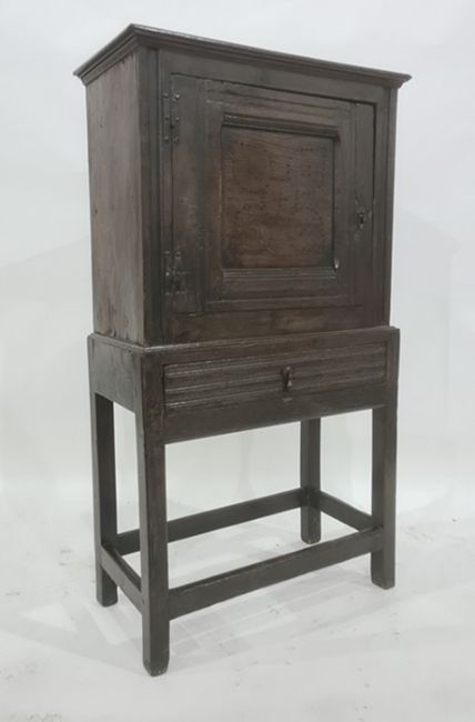 18th century oak livery cupboard, the rectangular top above cupboard door with pierced flowerhead decoration, on base with single drawer, square section supports and stretchered, 68.5cm x 123cm