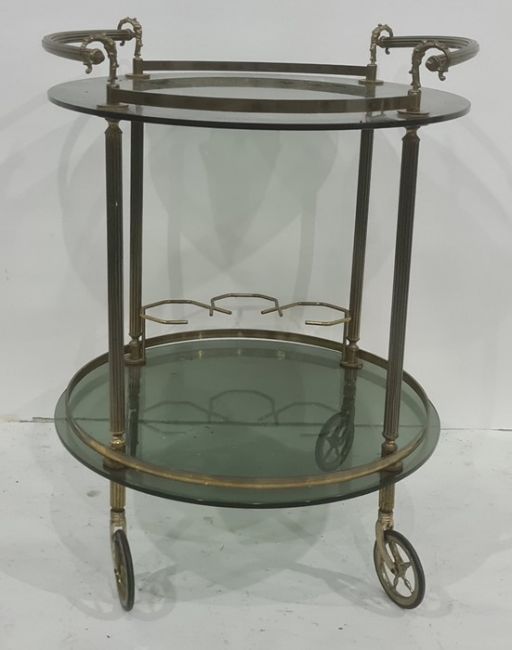 Two-tier drinks trolley, the smoked circular glass top with metal handles, smoked glass undertier with three drinks bottle holders, all raised on castors