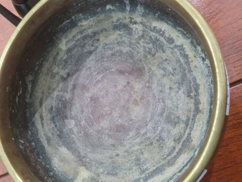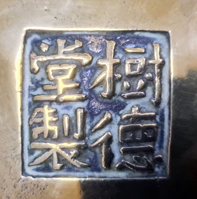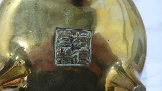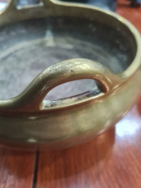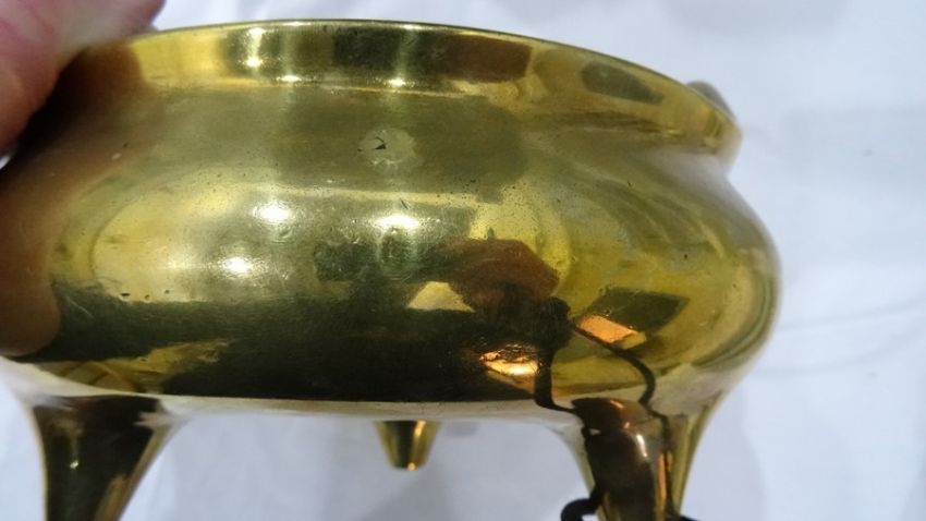 Chinese bronze censer circular, bulbous and two handled on three tab feet, 27cm diameter (four character marks to base) the height is 8.5 cms to the rim and 11.3 cms to the top of the handle, the weight is 2..22 kilog/Condition ReportThere is significant wear to the inside as well as some wear to the inside of the handles. There is a mark to one side and a small dent to the top of the censer. There are a couple spots of wear around the outside. We are unable to give an exact date but it could possibly be 19th century. See attached images.height is 8.5 cms to the rim and 11.3 cms to the top of the handle, the weight is 2..22 kilog/