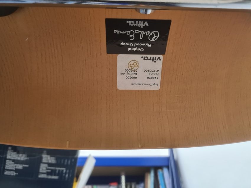 Set of six modern reproduction Charles Eames for Vitra plywood chairs (6) Condition ReportChair 1 - has scratches to the front of the back and a chip to the rear of the back. There are some small chips to base.Chair 2 - scratches to front of back, marks to the top. some white paint to the back.Chair 3 - Some chipping to rear of back.Chair 4 - Chip to back. some marks to the seat.Chair 5 - Chip to seat as well as scratches.Chair 6 - Chip to backAll seats have some marking to metal, see attached images.