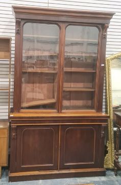 Late 19th century mahogany bookcase cabinet with ogee moulded pediment, above two glazed doors enclosing shelves, the base of two cupboard doors, raised on plinth, 129.5cm x 210cm