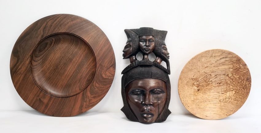Ingrained spalted birch shallow bowl, 35cm diameter, an Ingrained large figured and stained wood circular platter, 49.5cm diameter and an African carved hardwood mask with triple mask pediment