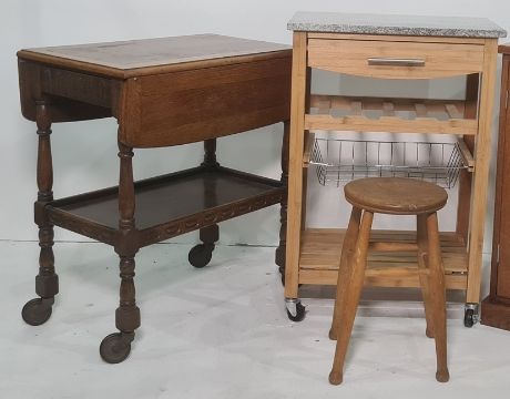 Modern kitchen trolley with granite top, on castors, a stool and a two-tier oak tea trolley (3)
