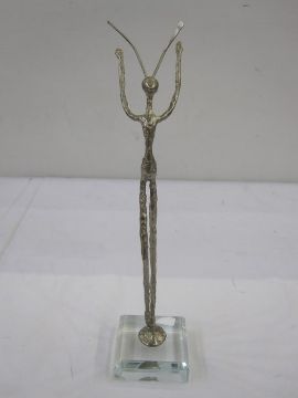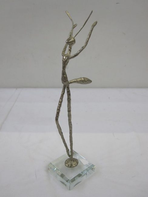 Contemporary silver-coloured sculpture, praying mantis-type model, on a square clear plastic base, unmarked, 26cm high