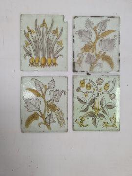 Four hand painted Aesthetic-movement glass panes or quarries, florally decorated, circa 1870, designs thought to be based on woodcut illustrations found in Elizabethan herbal books, notably 'Gerard's Herball', 12.5cm x 10.25cm (4)PROVENANCE: formerly at Bowden Hall, Upton St Leonards, Gloucestershire