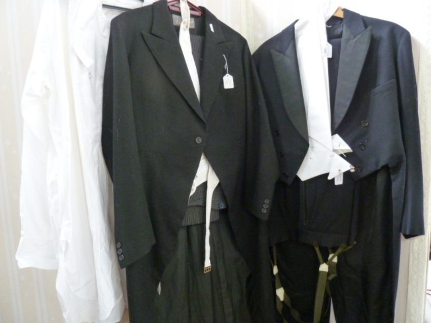 Vintage tail suit in very dark blue, with white waistcoat and trousers with braces, a black tail coat suit with white waistcoat, labelled 'Anton Wollnik' and a large dress shirt (3)