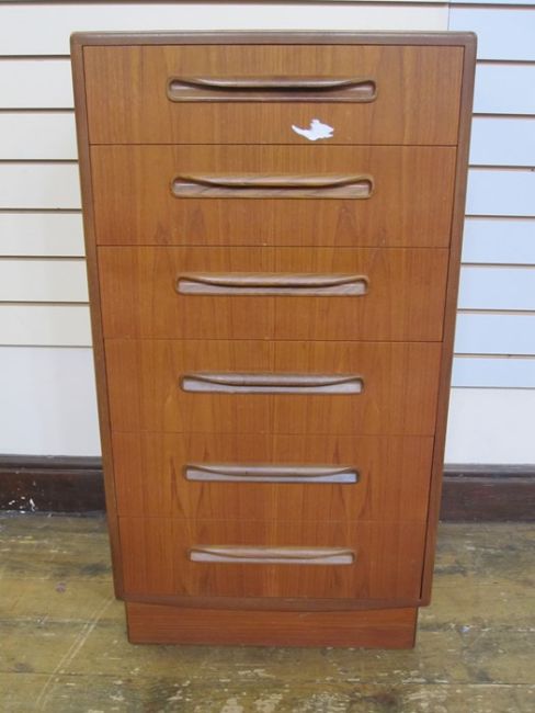 G-Plan chest of six drawers, on plinth base, 55.5cm wideCondition ReportAppears in overall good condition; some surface scratches to top and front drawers, paint marks (should be removable), no visible chips to corners or edges