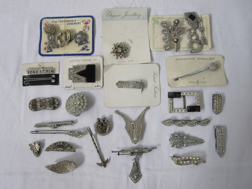 Quantity cards with vintage diamante set brooches and clips and other diamante set jewellery (1 box)