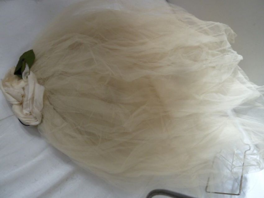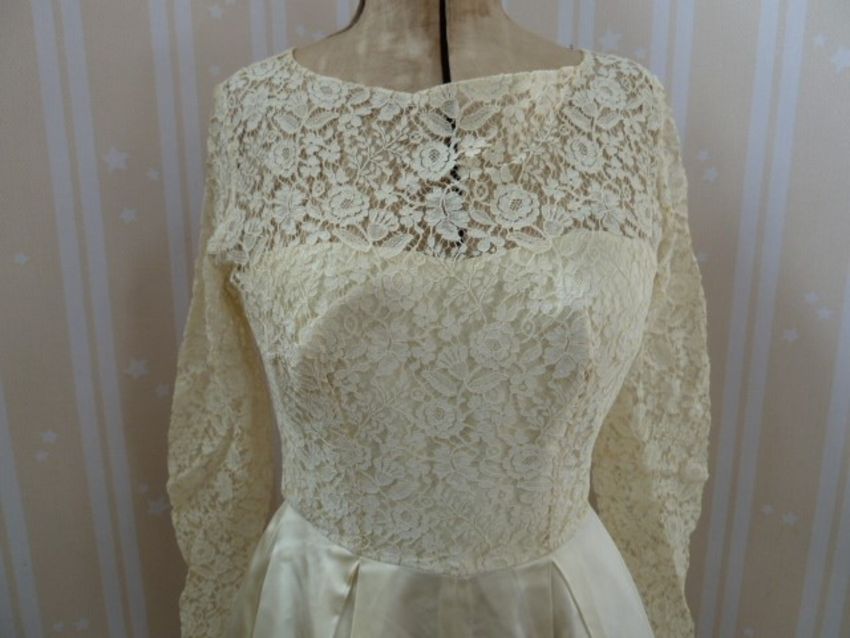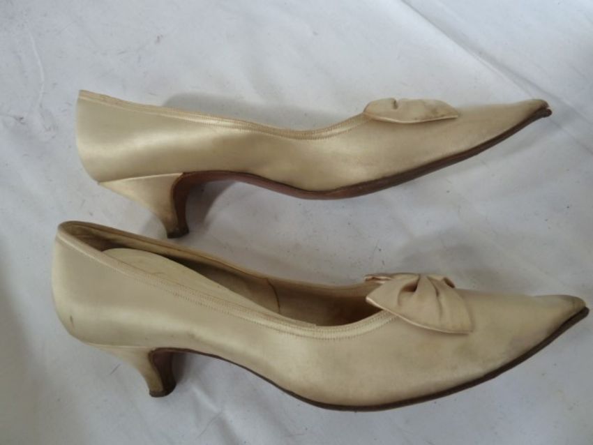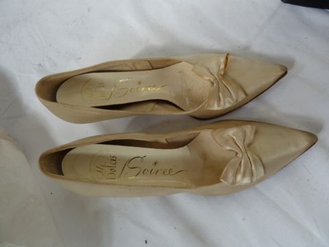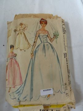 1960's satin and lace wedding dress with veil and faux-flower attachment, matching Dolcis satin shoes, the original  MacCalls pattern and remnants
