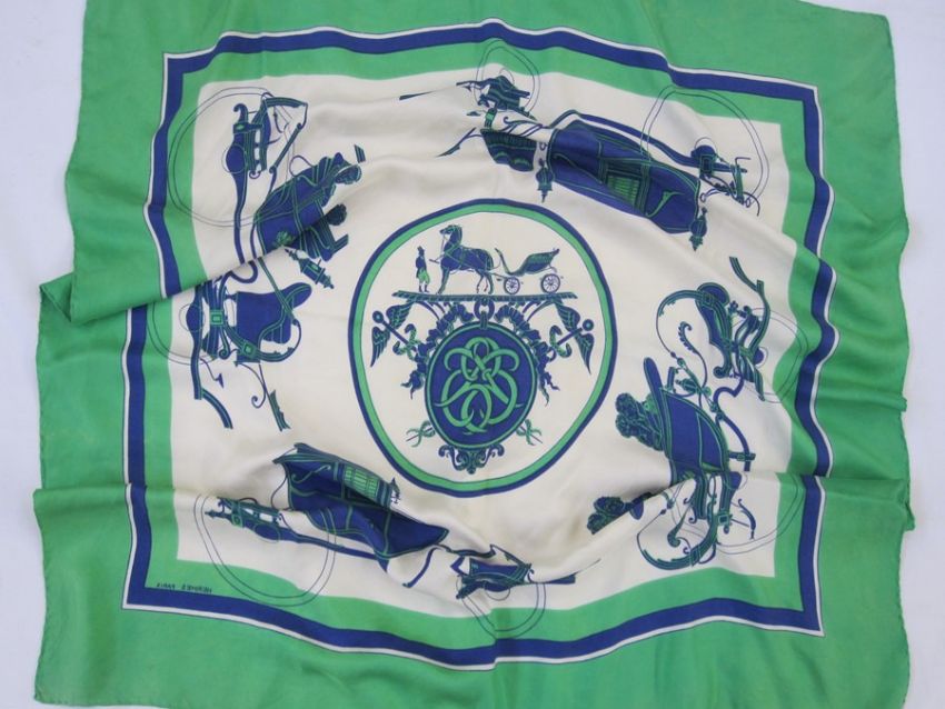 Hermes scarf 'Ex Libris', Hugo Grygkar 1946Condition ReportSome yellow staining mainly to the outer green edge (as if the colour has run), no holes or rips, all stitching intact