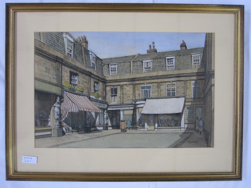 E W Moy  (20th century school)WatercolourCheltenham Montpellier street scene with caryatids , signed and  'Corfe Castle' ,  signed lower right, 28.5 x 42.5cm and 77.5 x 43cm (2)