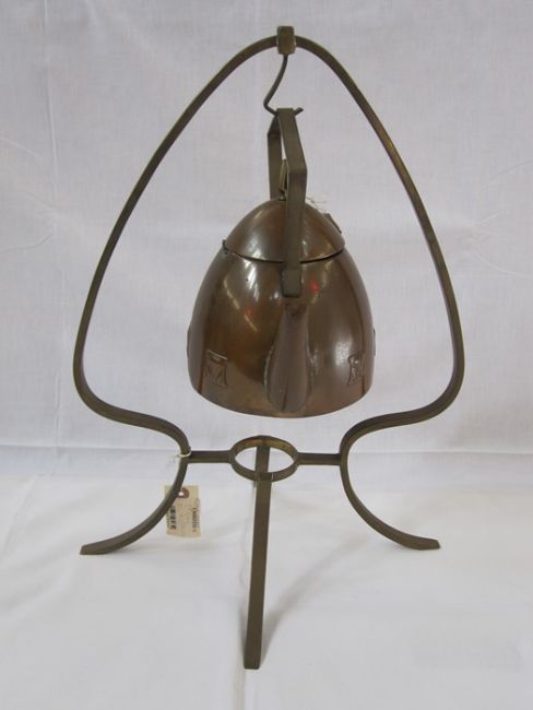Jugendstil brass and copper kettle on tripod stand, 46cm high (with Christies lot label for 28th February 2012 2538 lot 664)