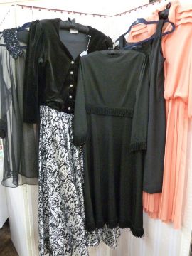 Vintage viscose black dress with fringe detail to the waistline, to the hem and to the sleeves, with a scoop back and buttons to the back, a Liz Claiborne crepe evening dress, a Winsley 1980's silver lame with devore velvet evening dress, silver buttons, black velvet top, full length, an apricot-coloured nylon dress with blouson top, pleated skirt, tie front, labelled 'Deze of London' and a black chiffon three-quarter length evening jacket with sequin detail to the collar and cuffs (5)