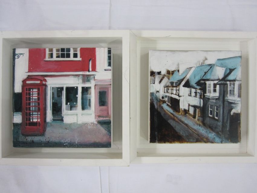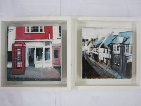 Camilla DowseAcrylic"Red phone box, Oxford",  and a Brighton Street Scene, a pair, one labelled to reverse, 18.5 x 19.5m (2) framed