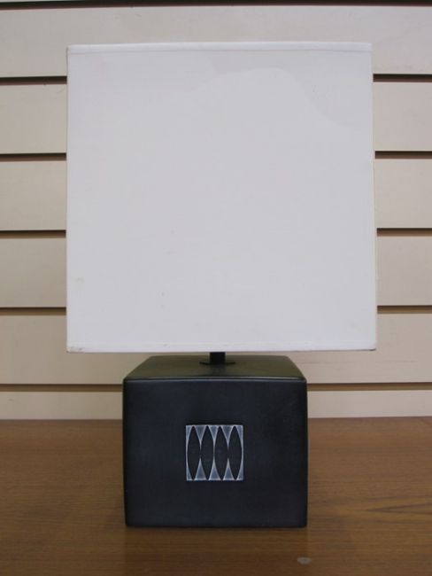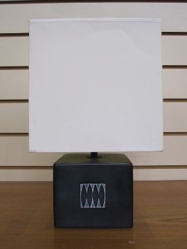 20th century table lamp and white shade, square-shaped, the black base with abstract design, labelled verso 'Designed and Manufactured by David Hunt Lighting Ltd'