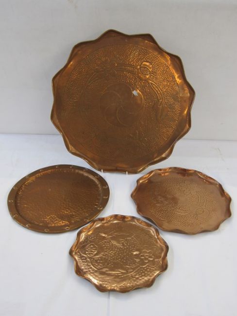 Newlyn style circular copper tray with wavy edge, floral and bud engraved, two similar smaller trays and circular and hammered tray (4)