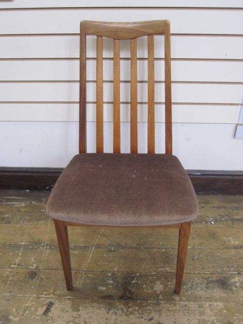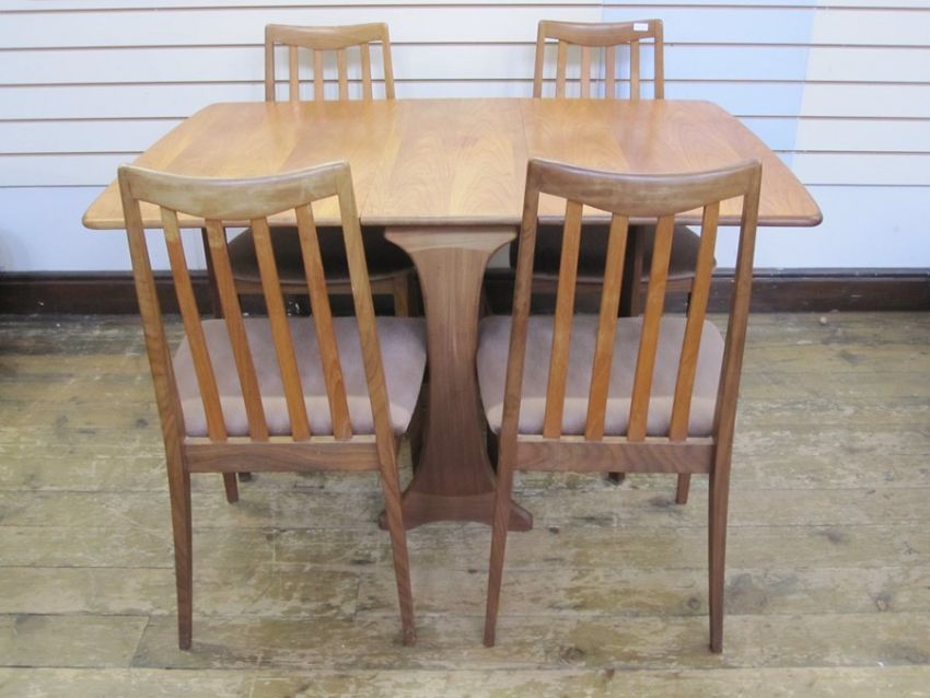 E Gomme for G-Plan set of four teak dining chairs with brown upholstered seats, label to undersides and drop-leaf table (5)
