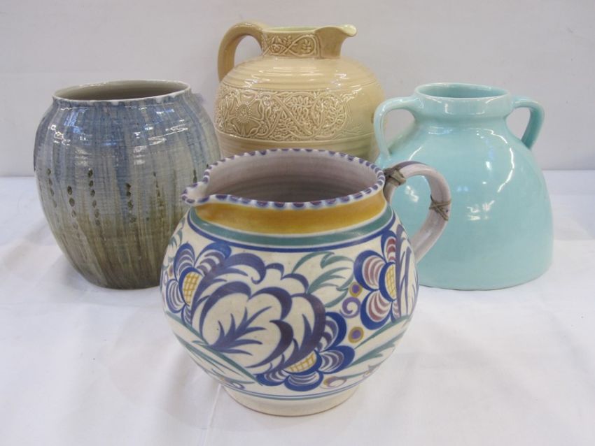 Poole pottery jug (damaged), Barnstaple two-handled vase, studio pottery vase marked to base 'Lockhead Kirkaid Bright' and Brentley ware Tudor jug (4)