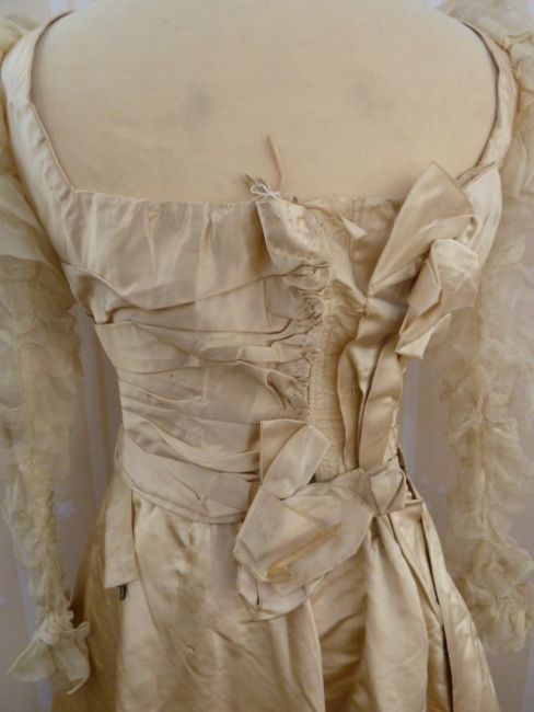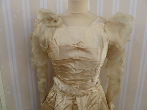 Victorian  ivory satin wedding dress with pleated bodice, full skirt, chiffon ruched sleeves - attached a handwritten note '1898 Wedding - wedding dress ....not worn at wedding - as Ellen was married " in her bonnet""Condition ReportOverall this dress, bodice and skirt, are in good condition.  There appear to be no marks on the satin, the sleeves are complete and not worn, there is some very slight staining on the pleated front of the bodice, the hooks and eyes are rusty, We believe from the note it has never been work and lain in a box for some decades. It has not been used for 'dressing up; that is obvious.If more detail needed we suggest ringing the saleroom 01242 252636 to ask specific questions