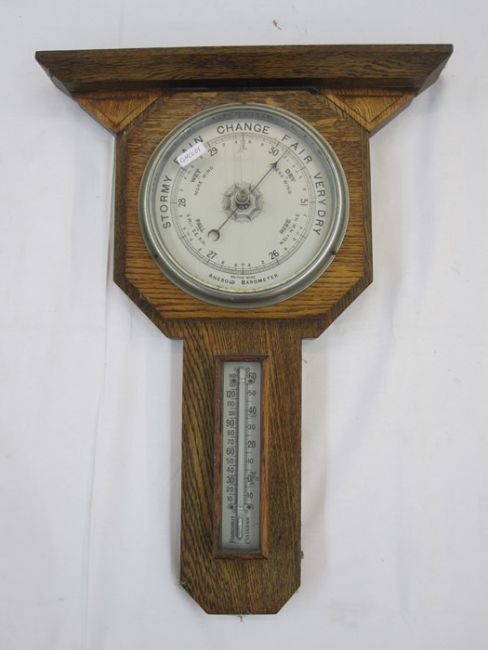 20th century oak aneroid barometer, geometric design 48cm