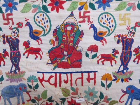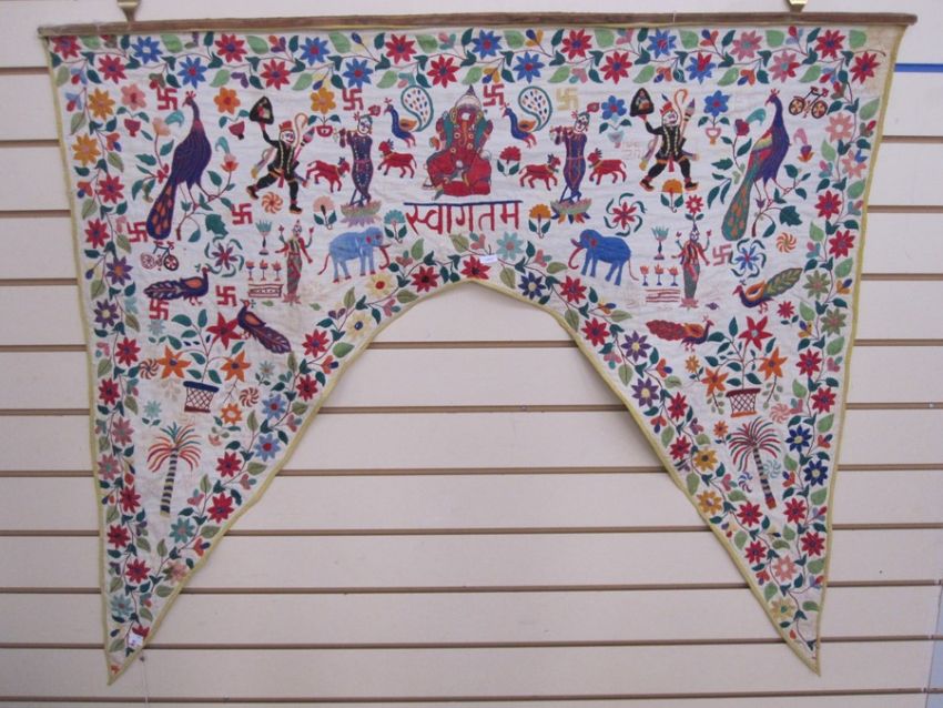 Hand embroidered possible tent hanging, showing Indian figures, birds, animals