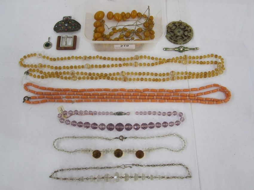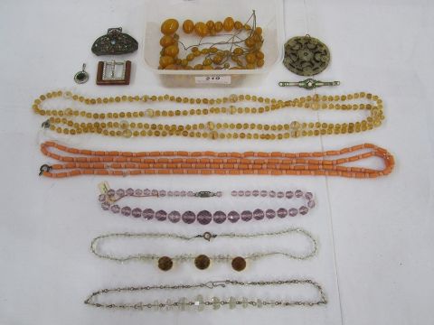String of graduated amber-coloured beads, coral beads, crystal and similar vintage bead necklaces