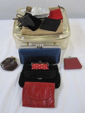 Loewe suede small shoulder bag with brown leather strap, a Liz Cox fabric bag, two Hermes velvet pouches, a small leather Grima pouch, a black velvet Christian Dior pouch, two Chanel small pouches, assorted purses, a clutch bag labelled Lizzie Lee and an Elizabeth Arden gold faux leather vanity caseCondition ReportThe two bags appear to be in overall good condition, both the exterior and interior.  All other items appear in good condition