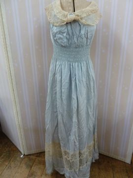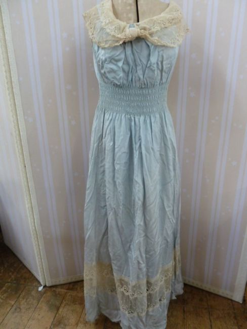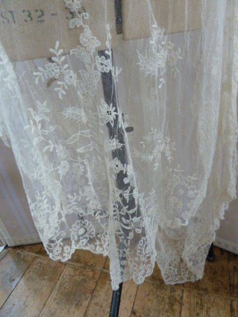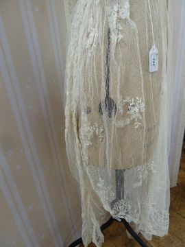Victorian lace overskirt and a late 19th century satin evening gown, collar undyed net lace, similar border on the hem (some loss to the material), ruched bodice, sleeveless (2)