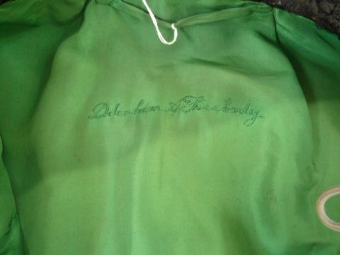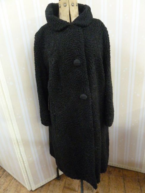 Persian lamb black vintage coat with three satin buttons, the green lining embroidered Debenham & Freebody