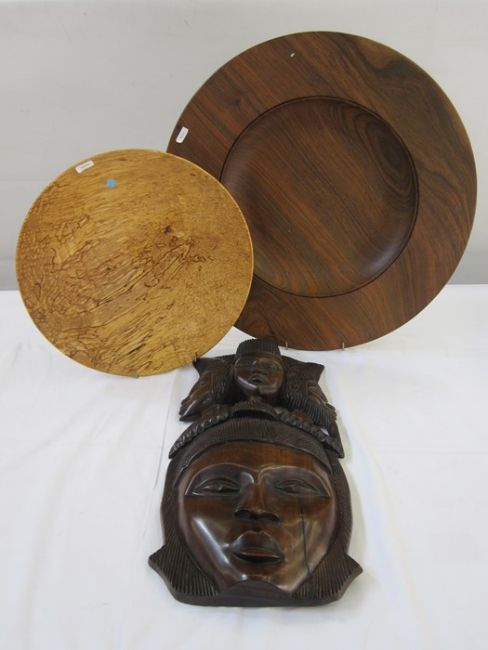 Ingrained spalted birch shallow bowl, 35cm diameter, an Ingrained large figured and stained wood circular platter, 49.5cm diameter and an African carved hardwood mask with triple mask pediment