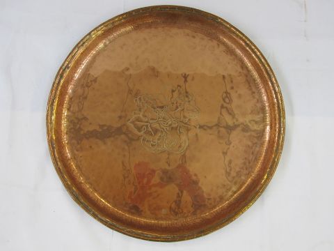 Arts & Crafts Hugh Wallace oval copper tray with brass handles, engraved floral motif to centre, initialled 'RCJ' and another circular copper tray by the same maker (2)