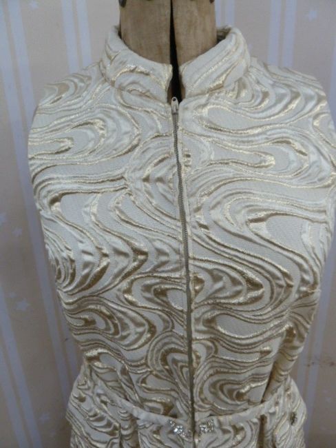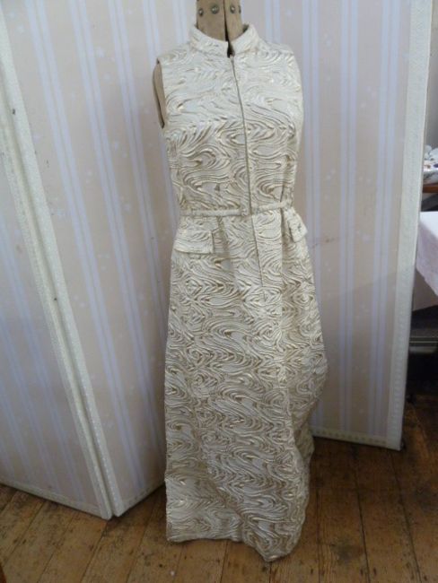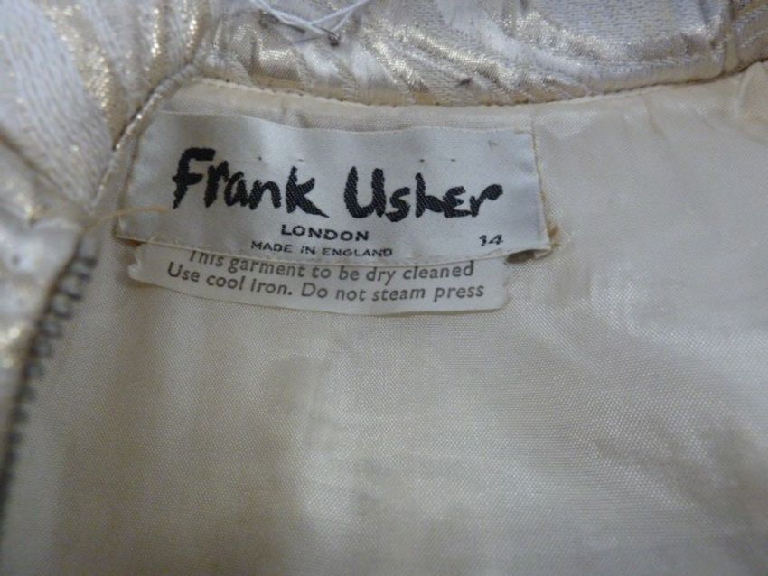 1960's gold lame Frank Usher evening gown, sleeveless, diamante buttons to the belt and pocket (one missing on one pocket), zip front