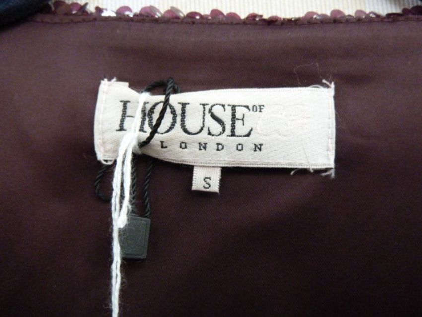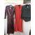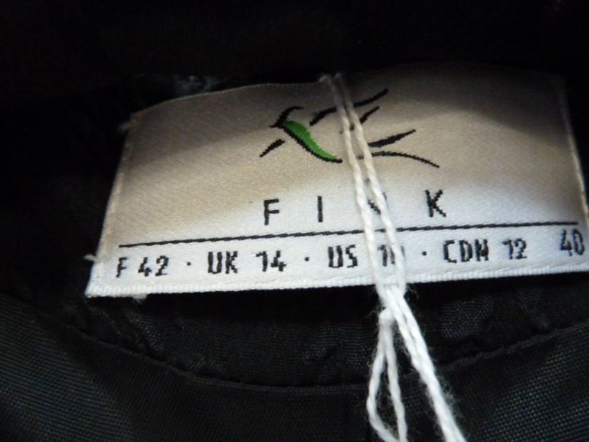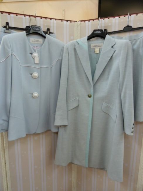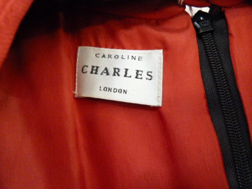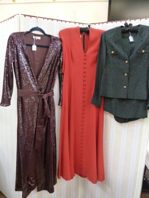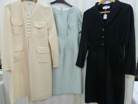 Black corduroy fitted coat labelled 'Paddy Campbell', three button fastening, a black suit with gold buttons, labelled 'Fink', a Laura B Couture satin cocktail dress with net and tape detail to the collar, a France Rety cream crepe coat with double pockets and seven loop and button front fastening, a Caroline Charles red crepe full length dress with elbow length sleeves, loop and button fastening all the way down the front, detail to the sleeves and the collar, Tomasz Starzewski vintage blue and white collarless jacket and skirt with large white buttons, another Tomasz Starzewski pale blue silk coat with single button fastening and matching skirt and a House London full length sequin tie front coat-dress