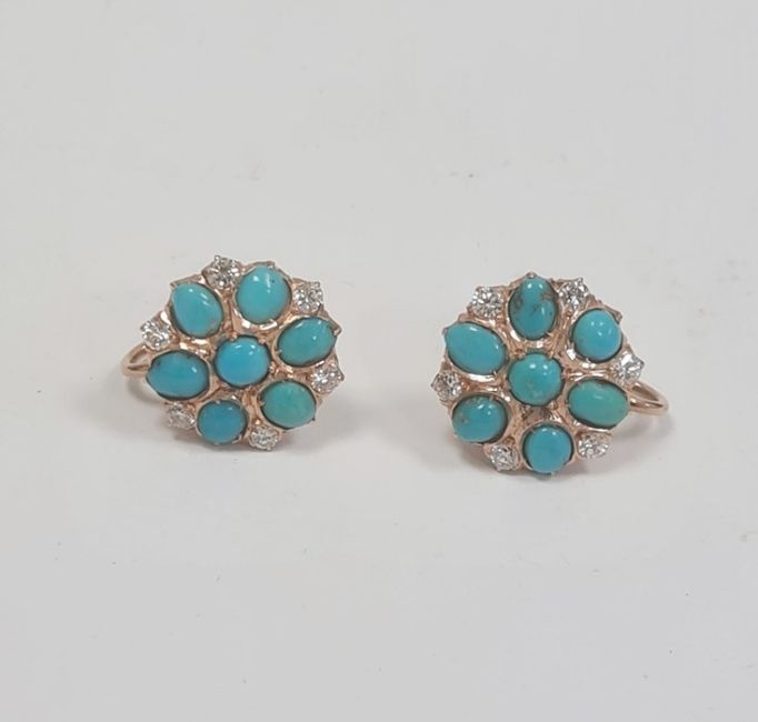 Pair of gold, turquoise and diamond circular cluster clip-on earrings, each set with central circular turquoise stone surrounded by six oval turquoise stones and six tiny circular diamonds, each 2cm diameter approx, 8.9g total (gold unmarked)