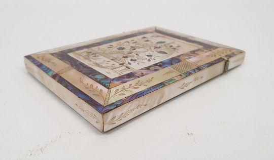 A 19th century mother of pearl and abalone inlaid card case, engraved decoration of peacocks amongst flowers, 10.6cm x 7.7cm