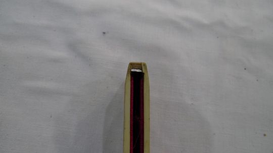 The closure works but is not tight. Some cracks in inlay. Piece missing on lid by catch. Lining is frayed and missing one piece by catch. See photos