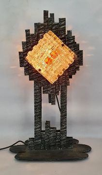 Iron and glass lamp of brutalist formCondition ReportThe height is 67cm approx. There is a crack to the glass on one side. There is wear to the base and to there are lots of holes to the sides but both look like that they could be design choices. See attached pictures.