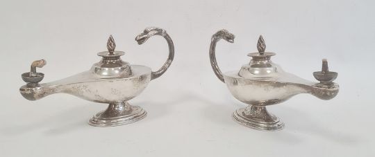 Pair silver table lighters, each in the form of Roman lamp with free scroll eagle's head handles, Goldsmiths and Silversmiths Company, London, datemark rubbed, 15.5cm wide