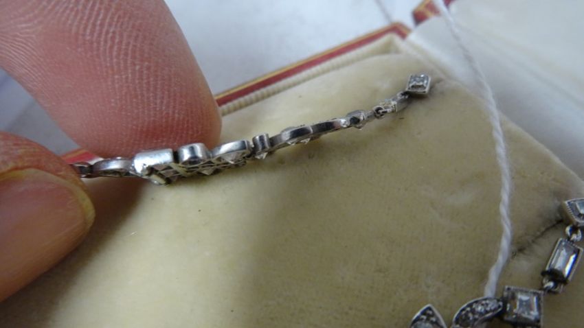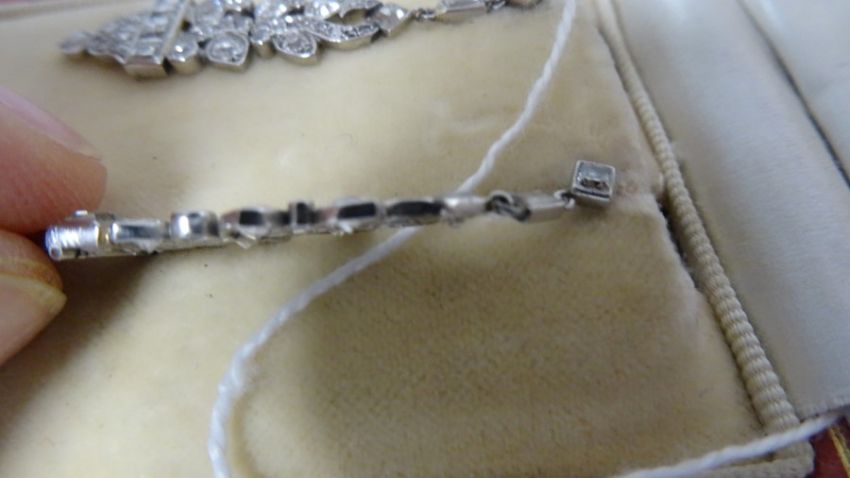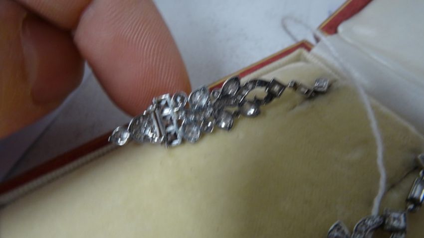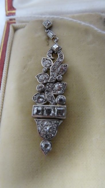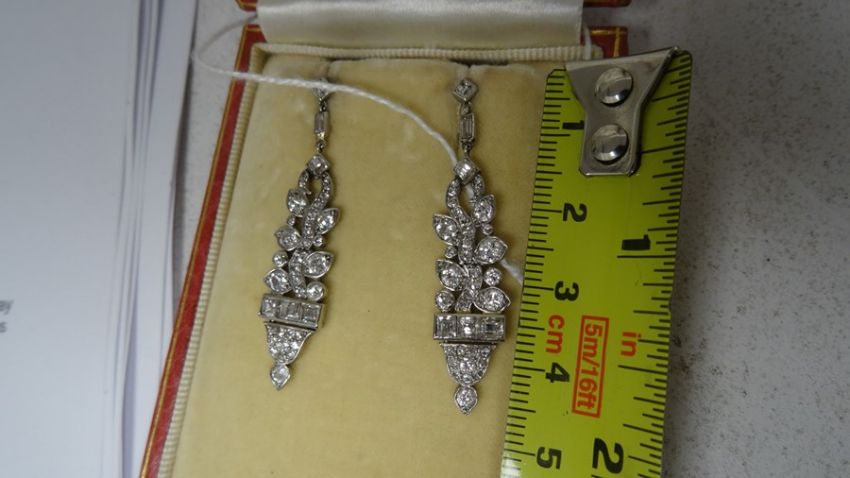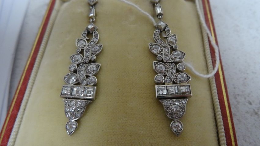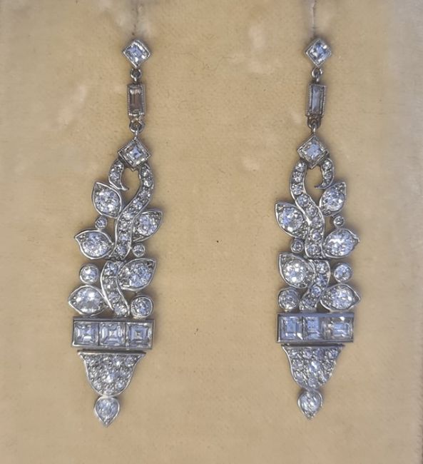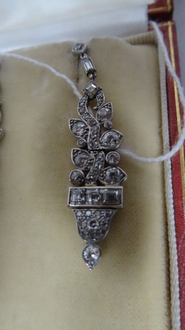 Pair of late 19th/early 20th century diamond set drop earrings, stylised leaf design, set with circular and baguette-cut diamonds, largest circular diamond 3mm diameter approx, largest baguette-cut diamond 2mm x 3mm diameter approx, stamped to clasp 'Megan Promis Brevete', in James R Ogden & Sons leather box Condition ReportPossible repair to the top of the drop - highlighted in photographsSilver coloured metal, unmarked and untested. 7.5g in total approx.Length 4.5cm approx.Movement to the earringsDiamonds generally white bright stones