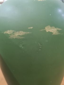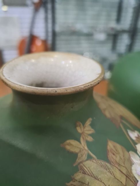 Pair Victorian Aesthetic movement earthenware vases, each of tall ovoid form, painted with strawberry plant sprays on a green ground, circa 1870-80, 33cm high (2) Condition ReportThe gilt on the top of both vases is worn and chipped, there is also crazing to the inside. On the back of one of the vases there a few small indents. There are a few spots of paint loos. One of the vase has a large chip.